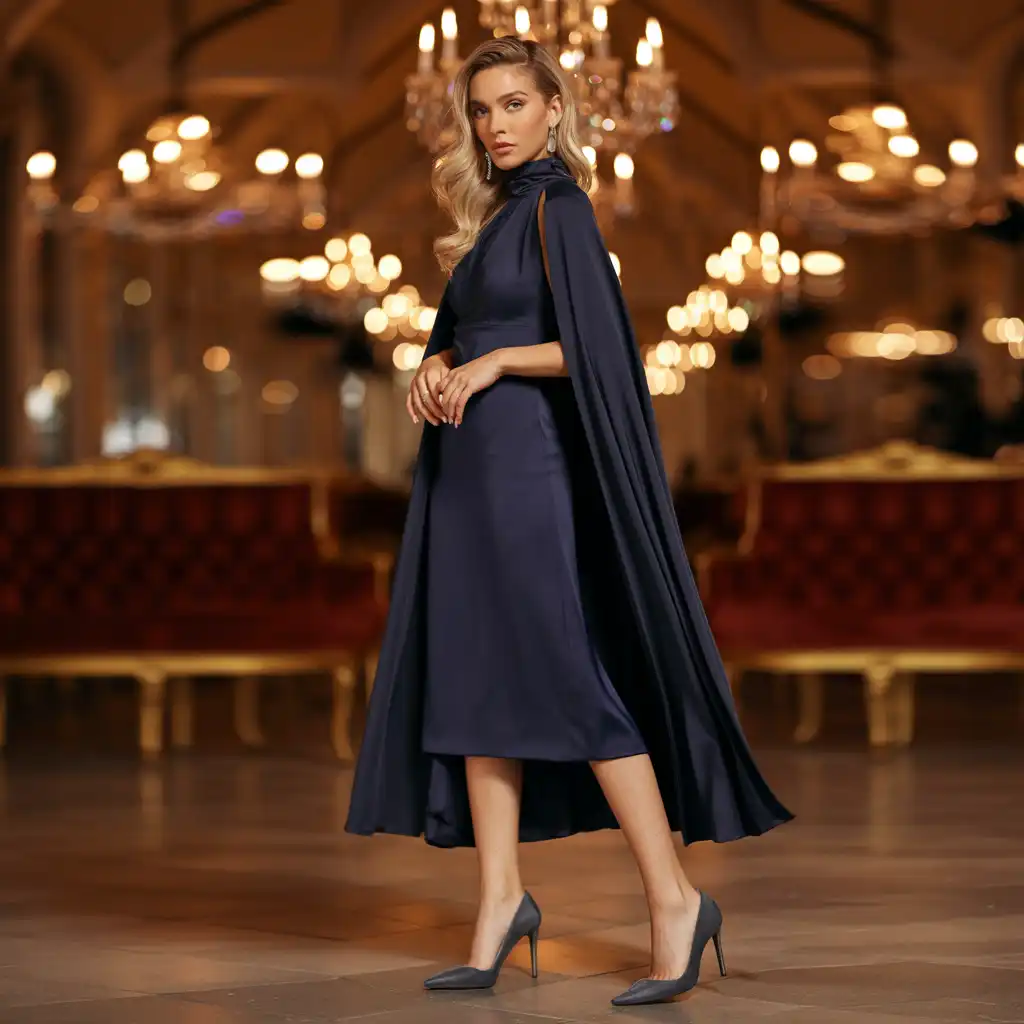An elegant cape dress offers a dramatic yet refined look for formal occasions. The flowing cape detail adds movement and grace while maintaining a polished silhouette. Choose rich shades like navy, emerald, or classic black for a timeless appeal. Pair with pointed heels and subtle jewelry to keep the focus on the design. This outfit is perfect for gala dinners, receptions, and upscale celebrations where you want to make a graceful statement.