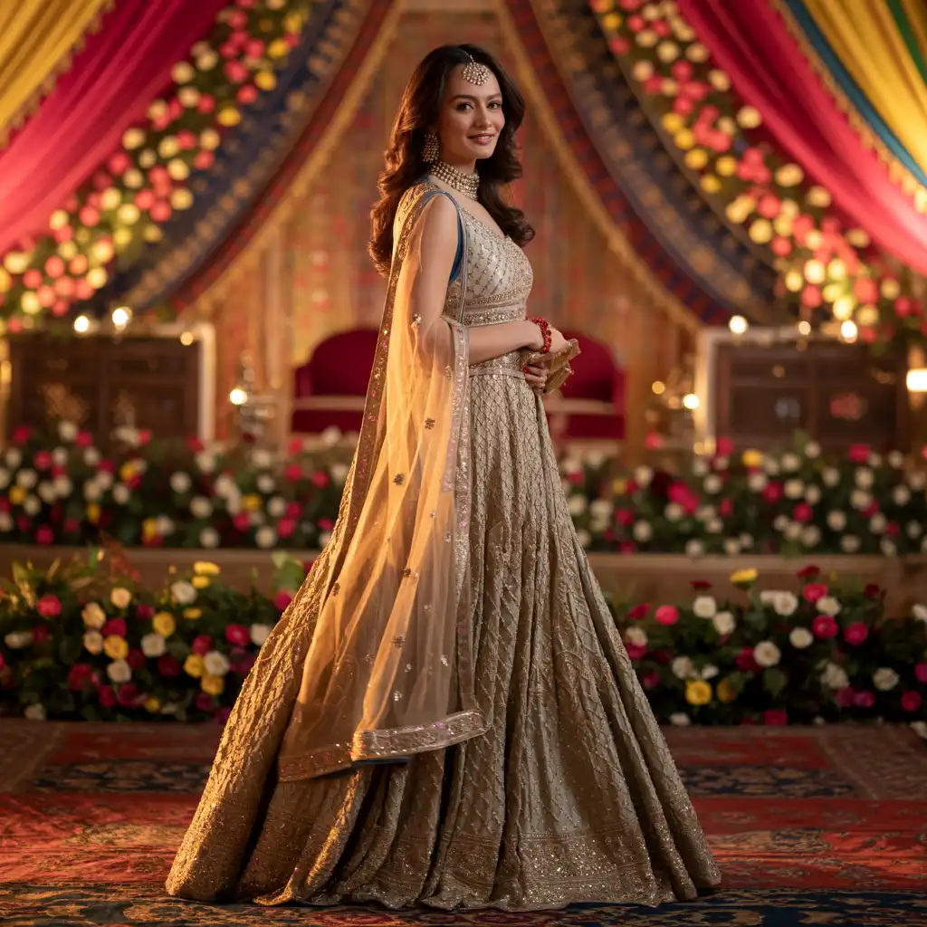 An embellished Anarkali gown brings cultural charm and sophistication to formal events. Intricate embroidery or subtle embellishments elevate the overall design. Flowing silhouettes add grace and movement, making it perfect for weddings or festive celebrations. Pair with matching heels and refined accessories for a complete look. This outfit beautifully blends tradition and elegance.