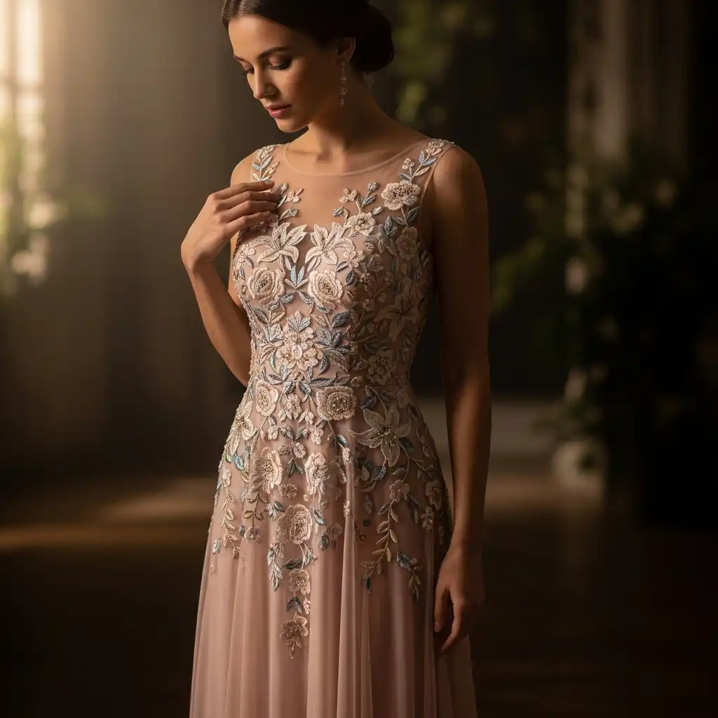 A floral embroidered evening dress brings romantic charm to formal occasions. Subtle embroidery enhances the design without overwhelming the elegance. Soft pastel bases or darker tones both create sophisticated results. Keep accessories understated to maintain harmony. This outfit works beautifully for weddings, engagement parties, and elegant celebrations.
