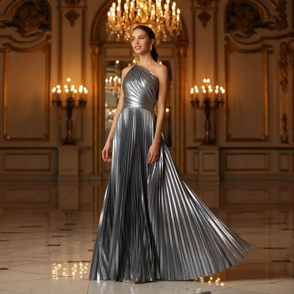 A metallic pleated gown adds shimmer and drama while maintaining refinement. The pleats create movement and texture, enhancing visual interest. Stick to muted metallic tones like gold, silver, or bronze for elegance. Pair with simple heels and delicate jewelry to avoid overpowering the outfit. This look is perfect for festive formal occasions and celebratory events.