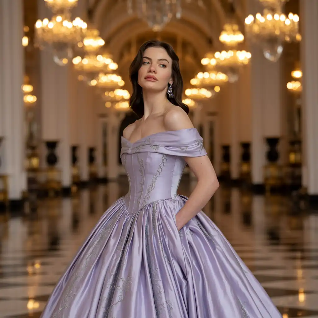 An off-shoulder ball gown exudes romance and grandeur. The neckline highlights your shoulders while the voluminous skirt adds dramatic flair. Soft pastel shades or rich tones enhance the elegance of the design. Pair with statement earrings and classic pumps. This ensemble is perfect for weddings, formal receptions, and luxurious evening celebrations.