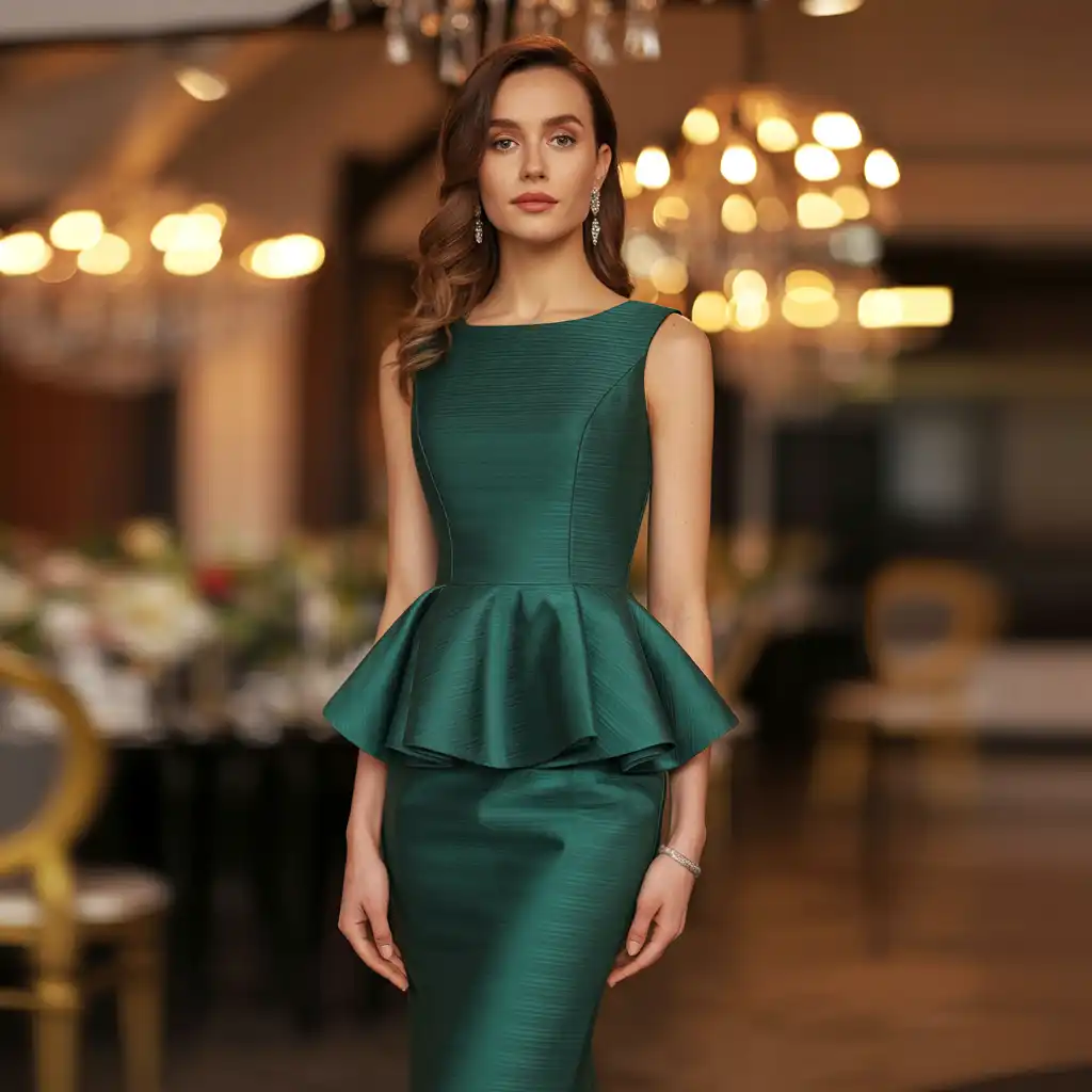 A structured peplum dress enhances your silhouette while maintaining class. The flared waist detail adds dimension and elegance to the overall look. Choose solid tones like burgundy, navy, or ivory for versatility. Pair with sleek heels and a compact clutch for a polished finish. This outfit feels confident, feminine, and suitable for formal gatherings or celebratory dinners.