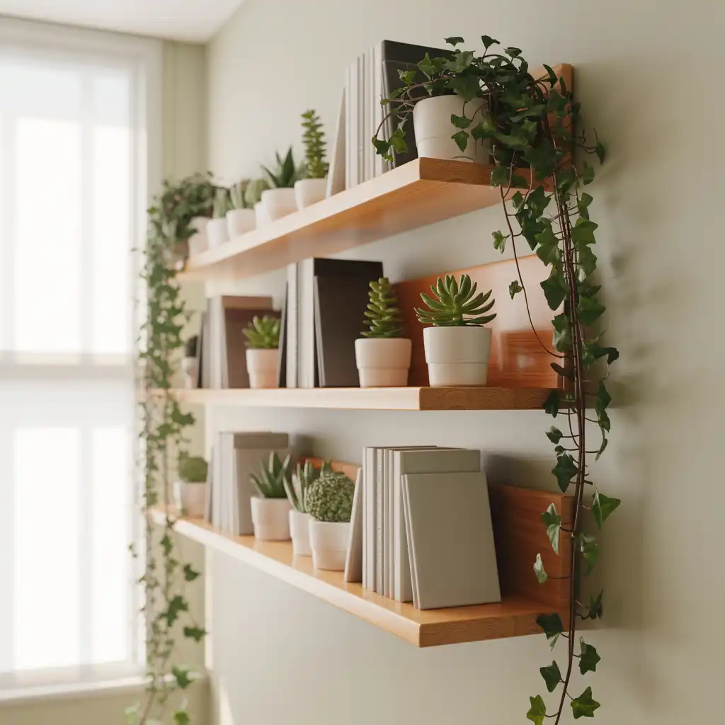 Floating shelves provide storage without occupying floor space. Display books, candles, and small décor items neatly for a balanced look.