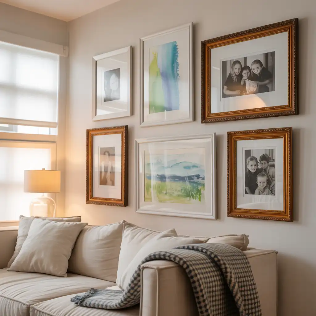 Create a curated gallery wall with framed prints and photos. Keep frames consistent in color for a cohesive look. This display adds character and visual interest to blank walls.