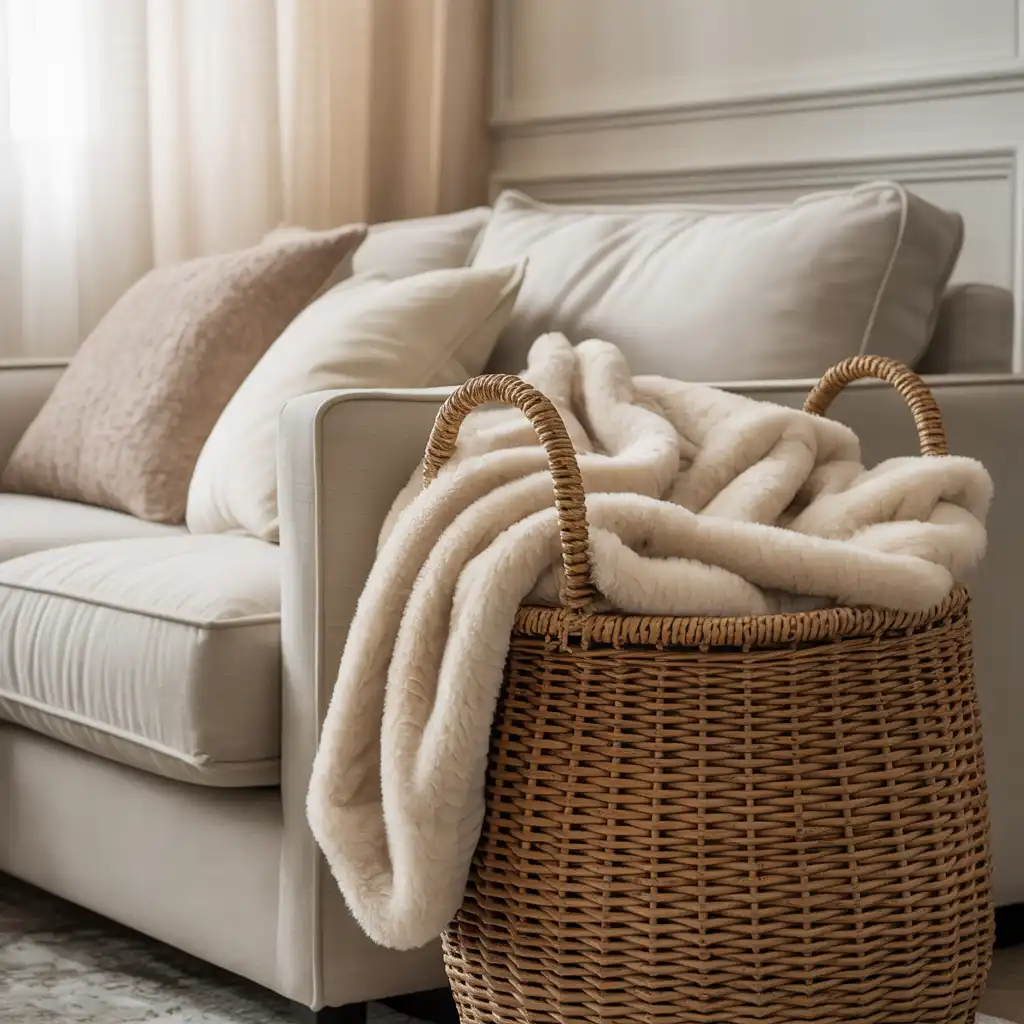 A woven basket filled with cozy blankets can serve as both storage and decoration in a living room. Placing it beside the sofa or near a reading chair adds a warm and welcoming touch. Soft blankets in different textures and colors enhance the cozy atmosphere while remaining easily accessible. This simple decor idea is perfect for creating a relaxed and comfortable environment that encourages lounging during cool evenings or quiet weekends.