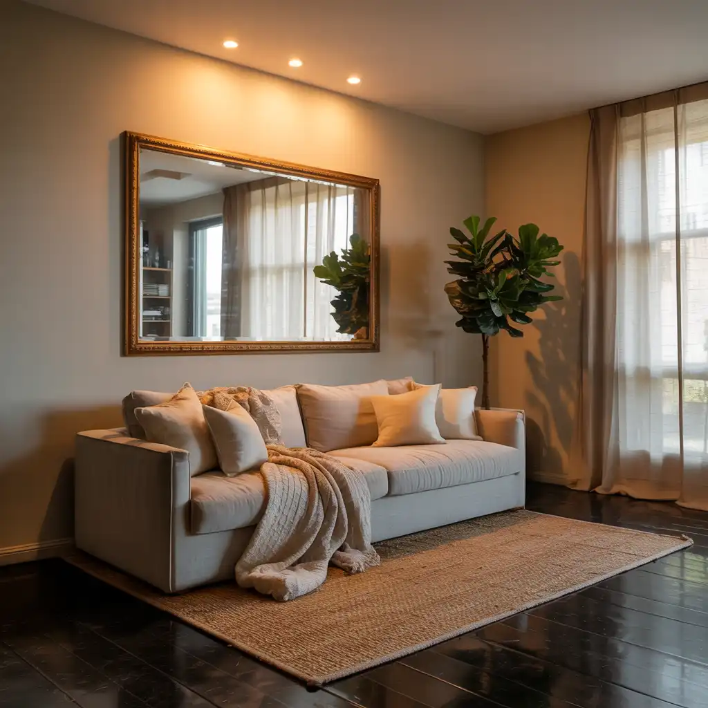 A decorative mirror is a powerful design element that can brighten and visually expand a living room. Large mirrors reflect natural light, making the space feel more open and airy. Placing a mirror above a console table or sofa creates a sophisticated focal point. Choosing frames in gold, black, or wooden finishes can match different interior styles. This simple decor idea adds elegance and depth while improving the overall atmosphere of the room.