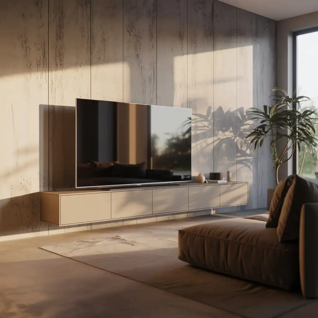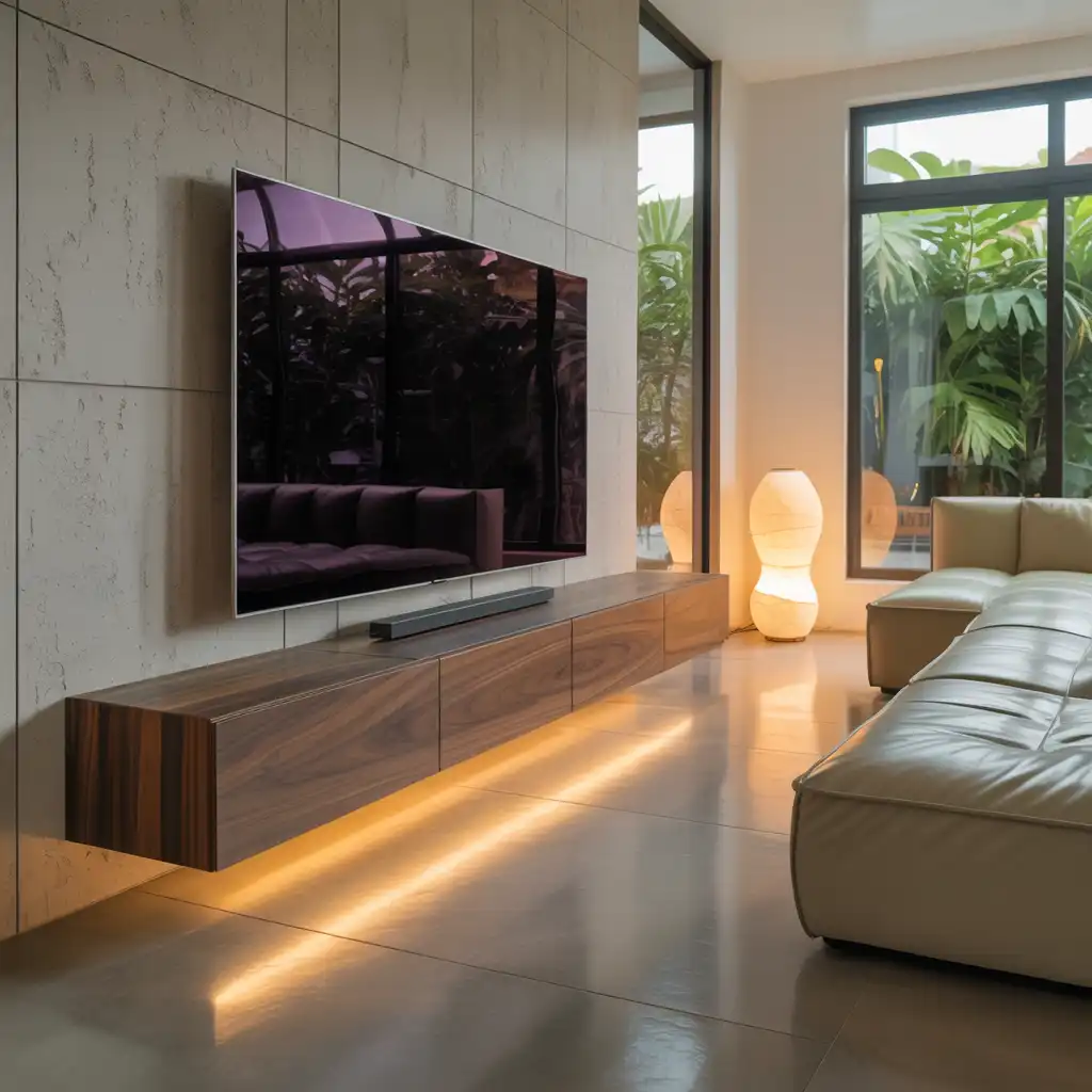 A floating TV unit is a stylish way to create a clean and modern living room look. Wall-mounted shelves or cabinets keep the floor area open, making the space appear larger and more organized. Decorative items like small plants, books, or candles can be placed on the unit to add personality without cluttering the design. The floating effect creates a sleek aesthetic while maintaining functionality. This decor idea works perfectly for modern homes where simplicity and elegance are the main design goals.