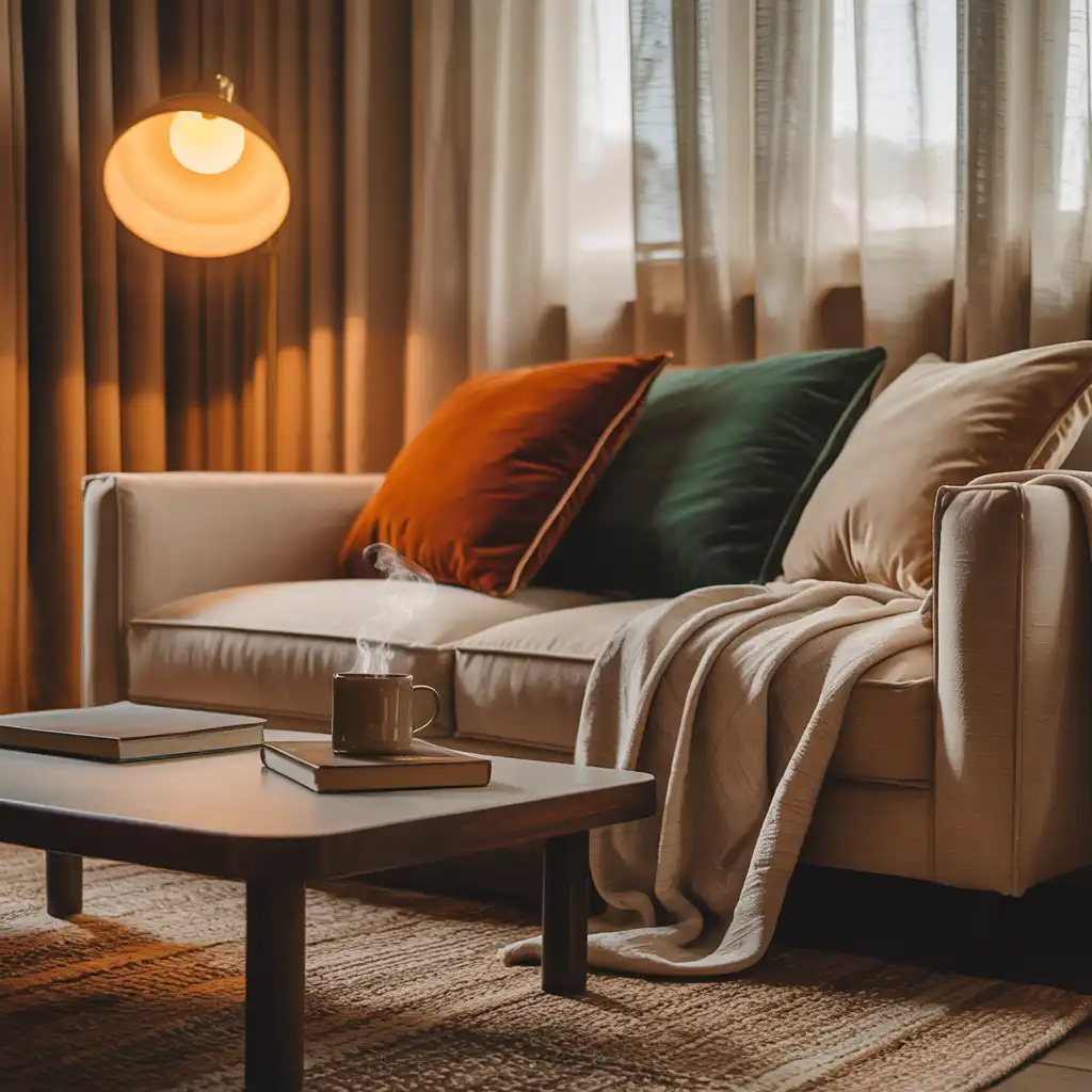 Lighting plays a major role in shaping the mood of a living room. Soft warm lights create a cozy and relaxing environment, especially in the evening. Floor lamps, table lamps, and wall lights can add multiple layers of lighting throughout the room. Warm lighting highlights furniture and decorative elements while making the space feel inviting. This decor idea is perfect for creating a peaceful atmosphere that encourages comfort and relaxation.