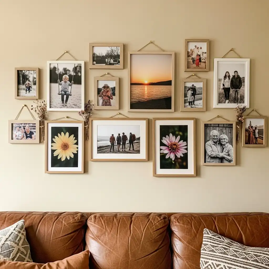 A DIY gallery wall filled with personal photographs creates a meaningful focal point. Use handmade or painted wooden frames to add a cohesive look. Arrange the photos in a balanced layout before hanging to ensure harmony. This idea celebrates memories while adding artistic detail to blank walls. A handcrafted gallery wall feels intimate and beautifully customized.