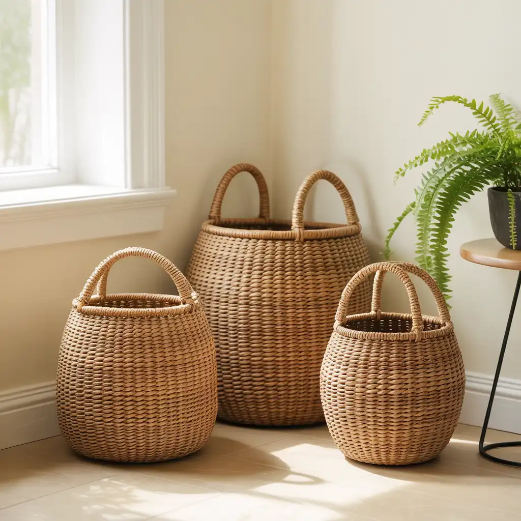 Handwoven baskets are practical and decorative at the same time. Use them to store blankets, magazines, or small essentials while maintaining a clean look. Natural fibers like jute or rattan create a warm, earthy atmosphere. Placing baskets in corners or under console tables keeps the space organized and visually pleasing. Their handcrafted appeal adds authenticity and texture to any room.