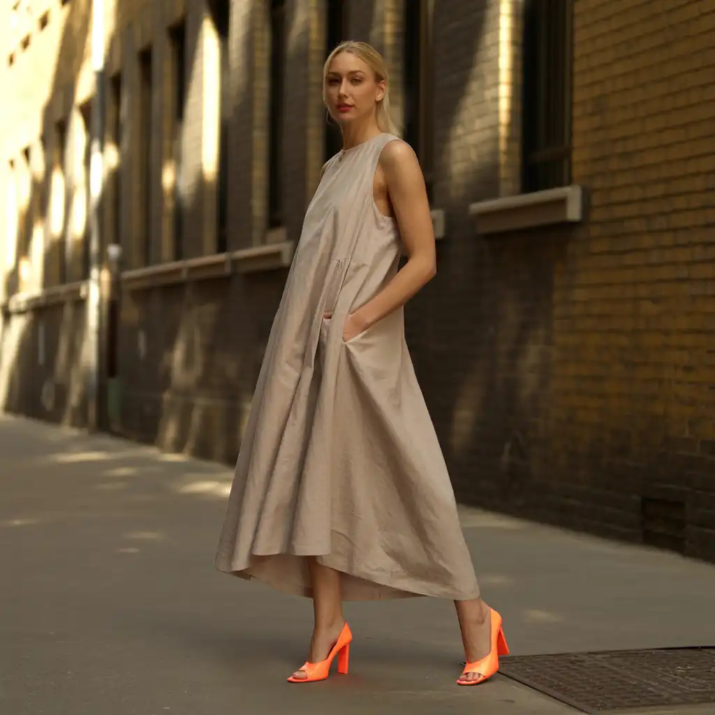 Neon heels elevate classic outfits with confidence. A simple black or white dress becomes eye-catching when paired with bold footwear. The bright shoes create a strong focal point and give a powerful fashion-forward appearance.