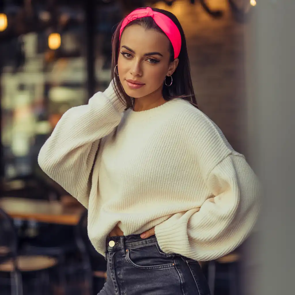 A neon scarf adds texture and bold color. Drape it loosely for effortless elegance.