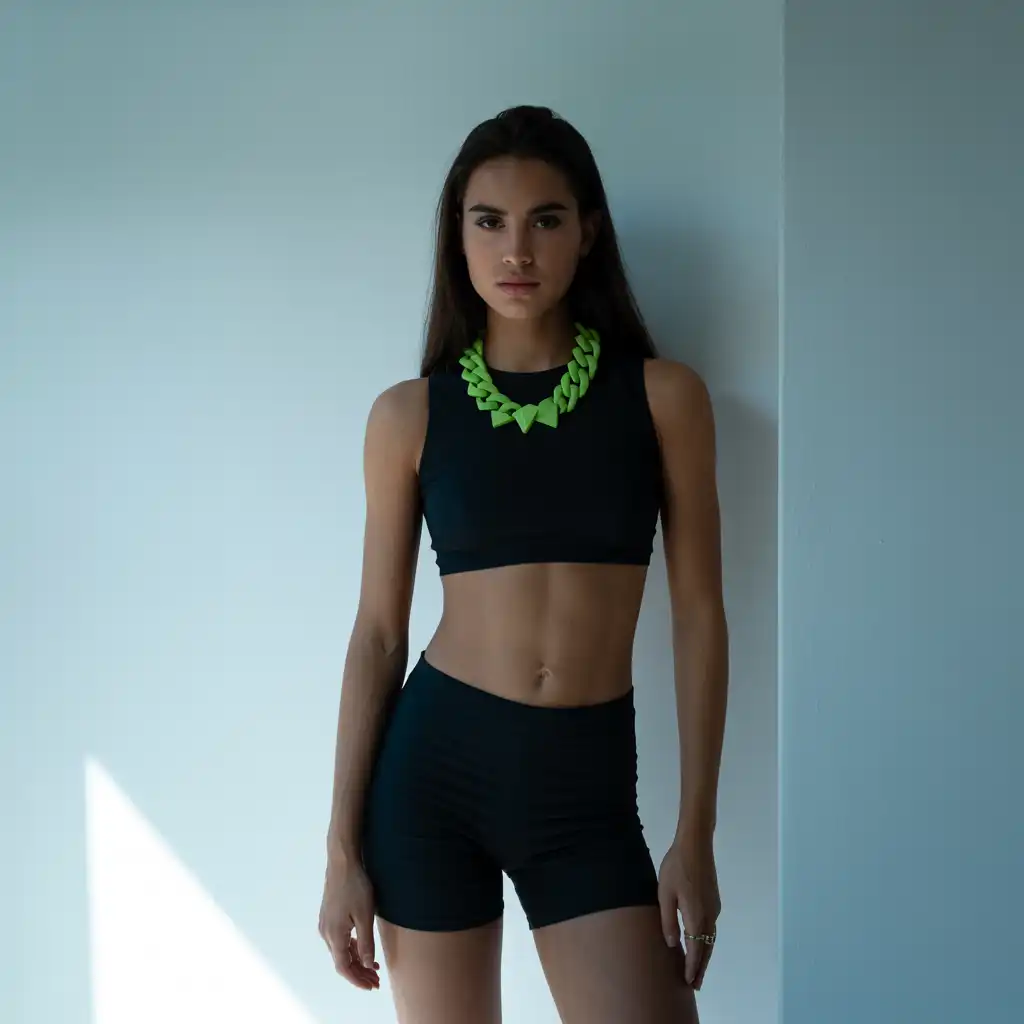 A chunky neon necklace turns a plain top into a fashion statement. The bright color frames your neckline and adds artistic flair.