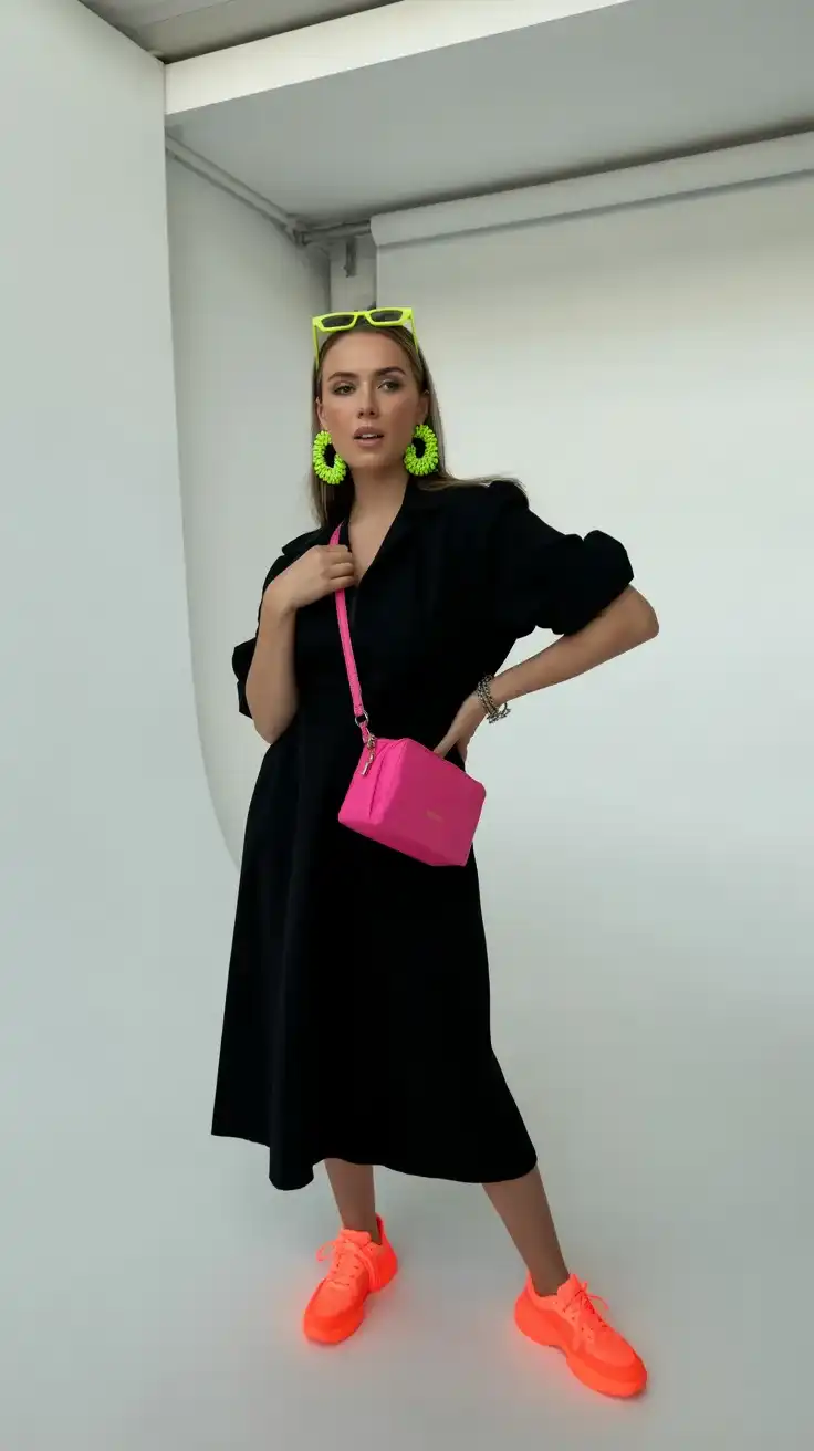 Neon heels elevate classic outfits with confidence. A simple black or white dress becomes eye-catching when paired with bold footwear. The bright shoes create a strong focal point and give a powerful fashion-forward appearance.
