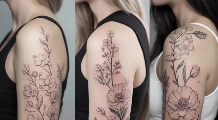 A delicate rose tattoo on the upper arm (arm tattoo ideas) offers timeless beauty with emotional depth. Roses...