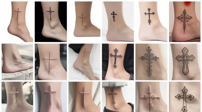 A fine-line cross ankle tattoo is perfect for those who value simplicity and quiet symbolism. This design uses...