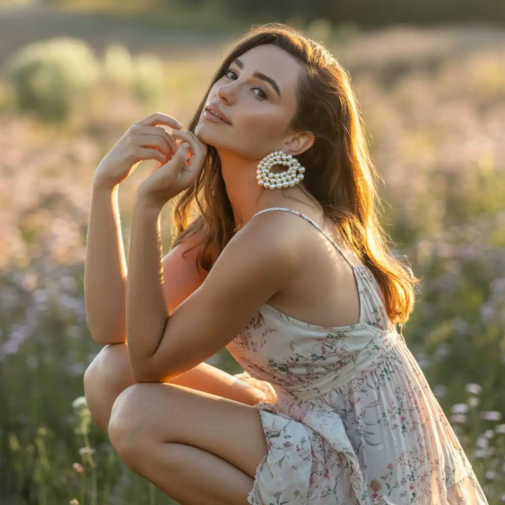 Floral dresses look even more charming with pearl statement earrings. The soft feminine print blends beautifully with the elegance of pearls. This outfit is perfect for daytime events, garden parties, and picnics. Pair it with sandals and light makeup for a fresh and graceful appearance.