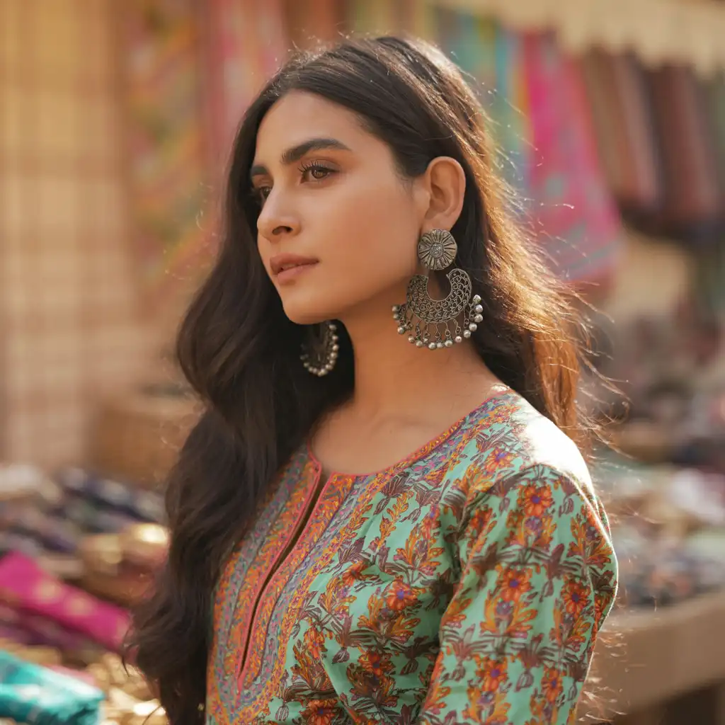 Kurtis paired with oxidized earrings create a trendy ethnic fusion look. The silver tones add charm and character. This style is ideal for daily wear, college, and casual gatherings. Add flats and a tote bag for comfort and style.