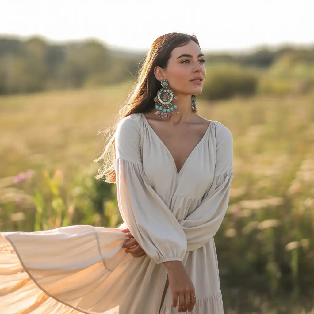 Maxi dresses look dreamy with boho-inspired earrings. The flowing fabric and earthy accessories create a relaxed yet fashionable style. This combination is perfect for vacations, beach walks, and outdoor events. Add flat sandals and natural makeup for a soft, free-spirited look.