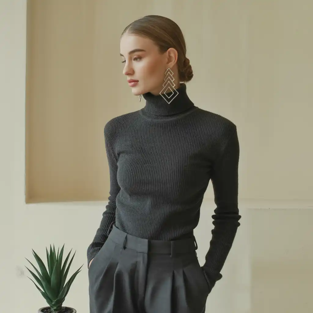 Turtlenecks paired with bold earrings look classy and modern. The covered neckline highlights the accessories beautifully. This style is perfect for winter fashion lovers. Add boots and a coat for a complete elegant look.