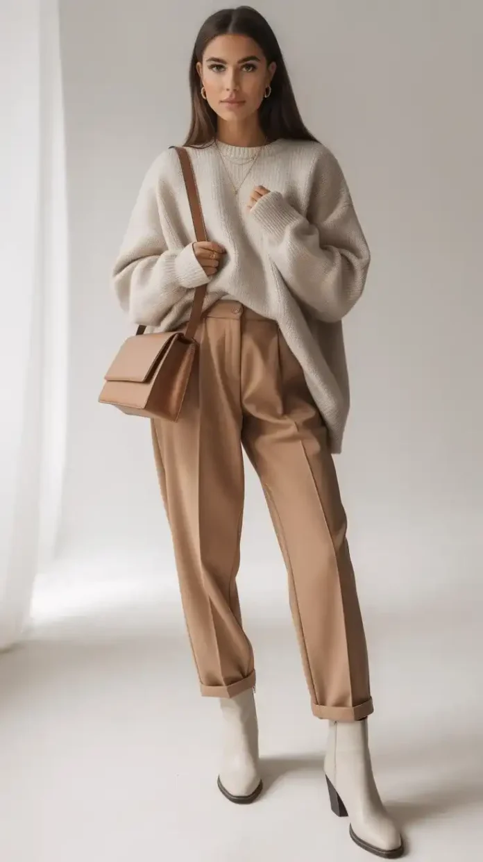 Pairing an oversized sweater with a midi skirt balances cozy and chic. The mix of textures adds depth. Choose warm autumn tones like rust or olive. Finish with boots for a trendy seasonal statement.