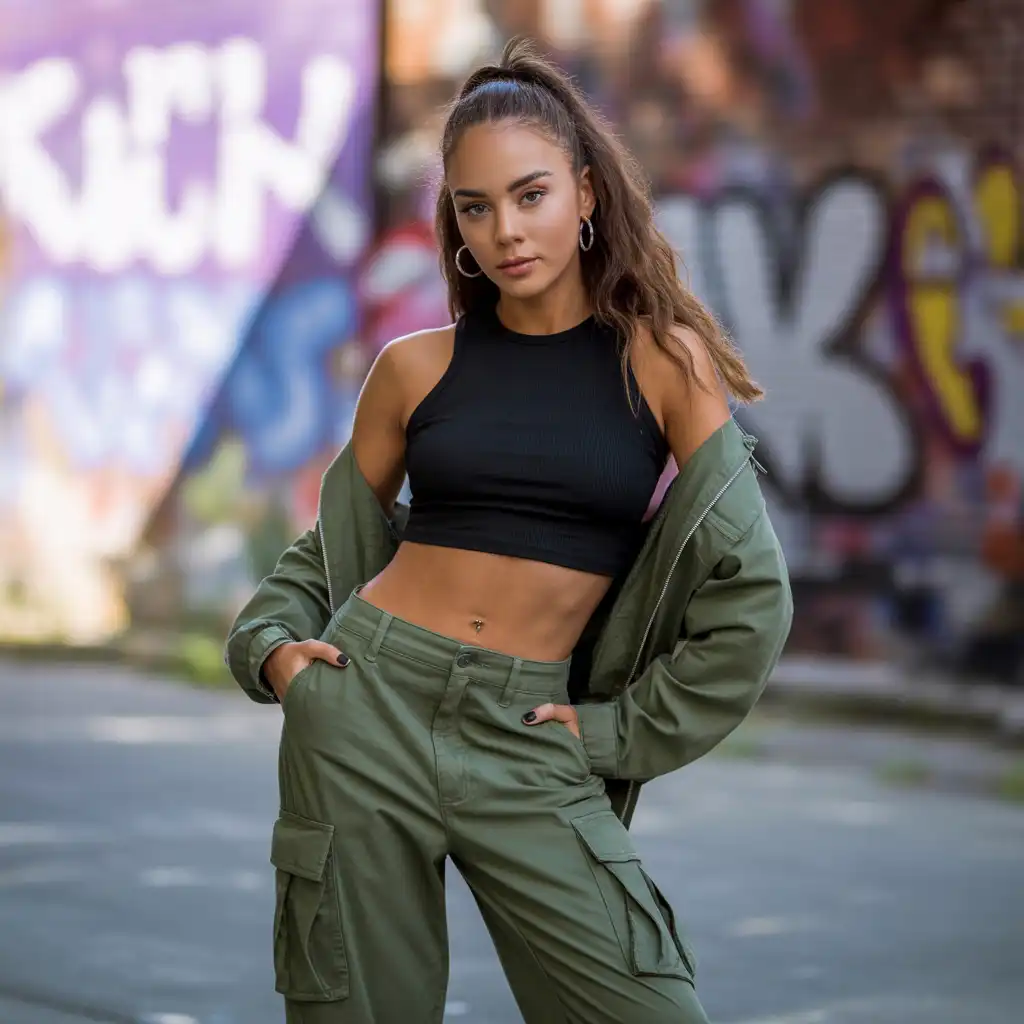 Cargo pants add utility chic energy. Pair with fitted tops for balance. Sneakers complete this cool-girl aesthetic.