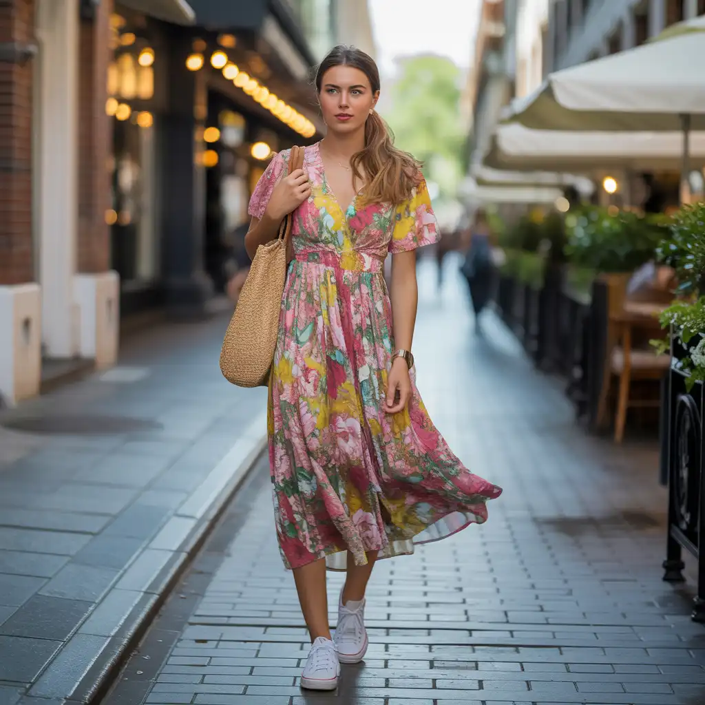 A flowy floral midi dress styled with clean white sneakers blends femininity and comfort. This combination feels fresh and playful for spring days. Add a crossbody bag and minimal jewelry to keep the look light. It’s perfect for city walks, café visits, or casual outings while staying trendy and relaxed.