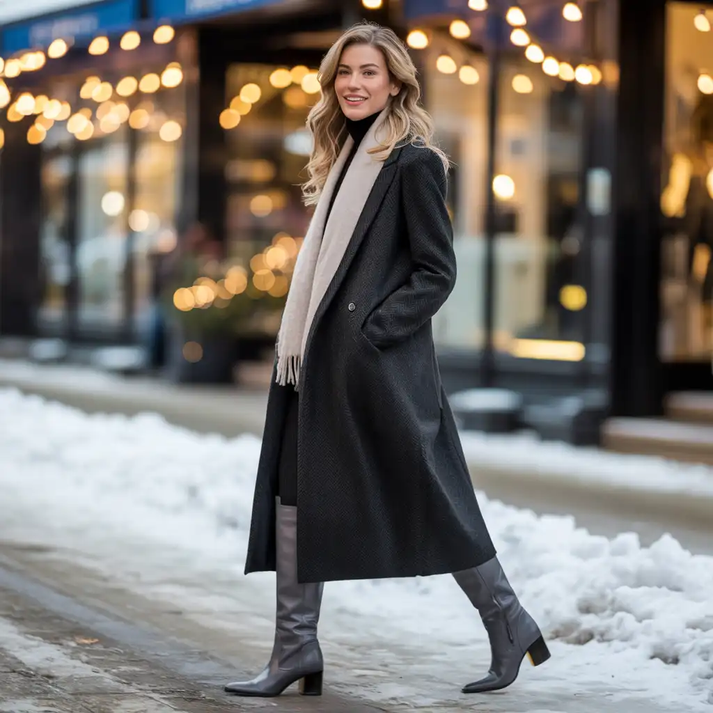 A long wool coat styled with knee-high boots creates a powerful winter look. Layer with slim jeans or tailored trousers. This outfit keeps you warm while maintaining sleek street elegance.