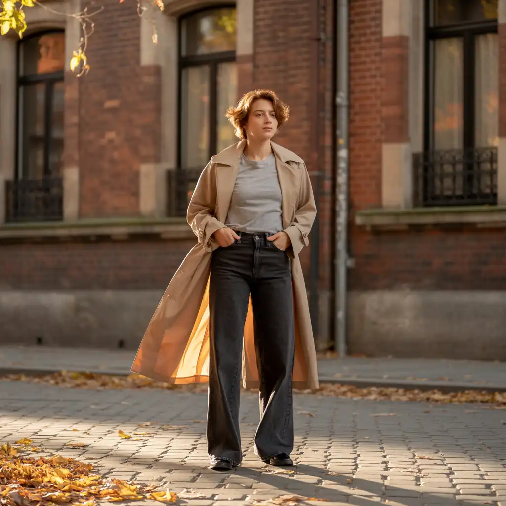 A classic trench coat is perfect for layering in autumn. Wear it over jeans and a knit top for instant elegance. Neutral shades keep the look modern and versatile.